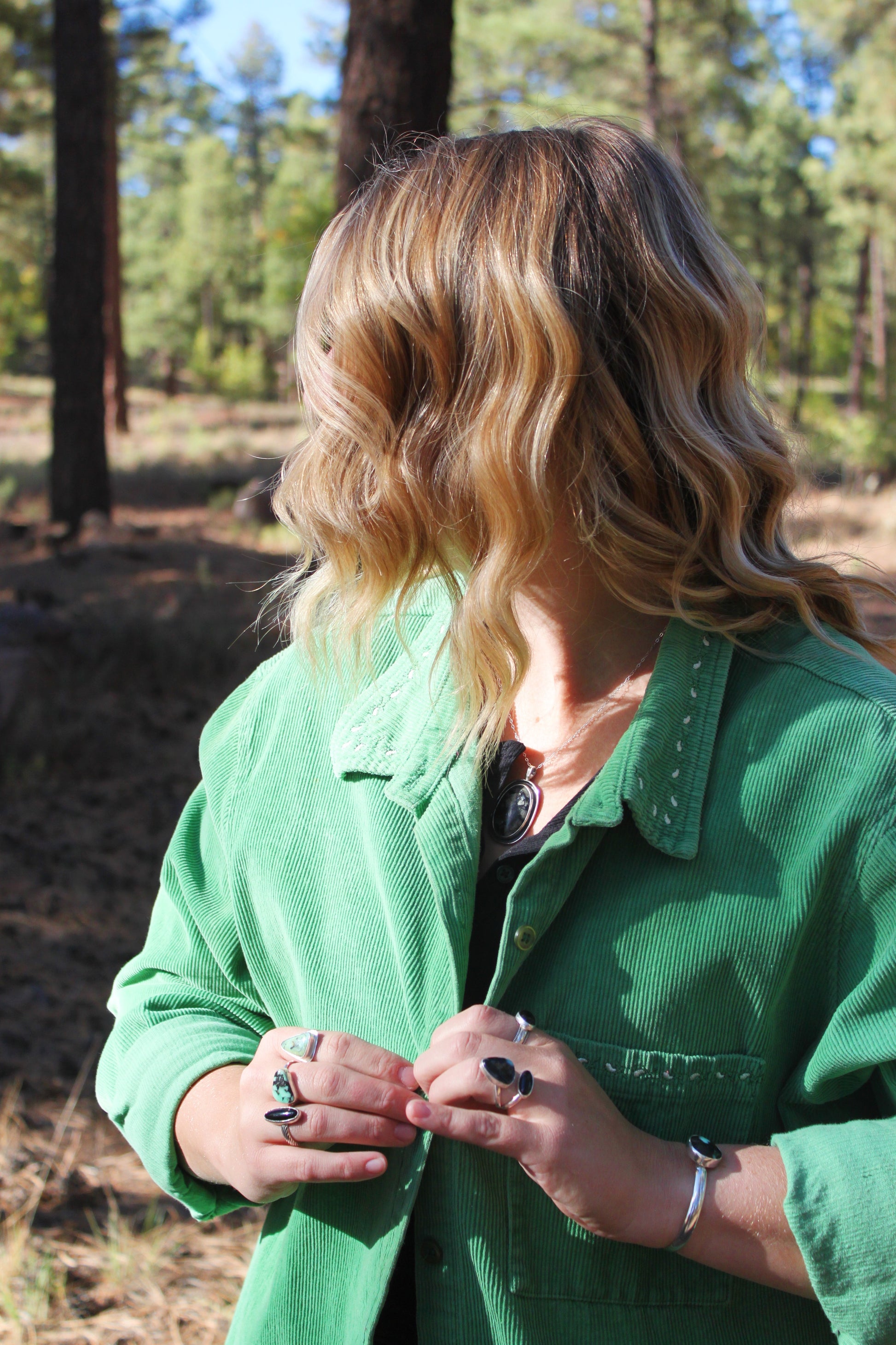 This ring has been handcrafted with ethically sourced New Lander turquoise and obsidian stones, and 100% 925 sterling silver, making it truly one of a kind.