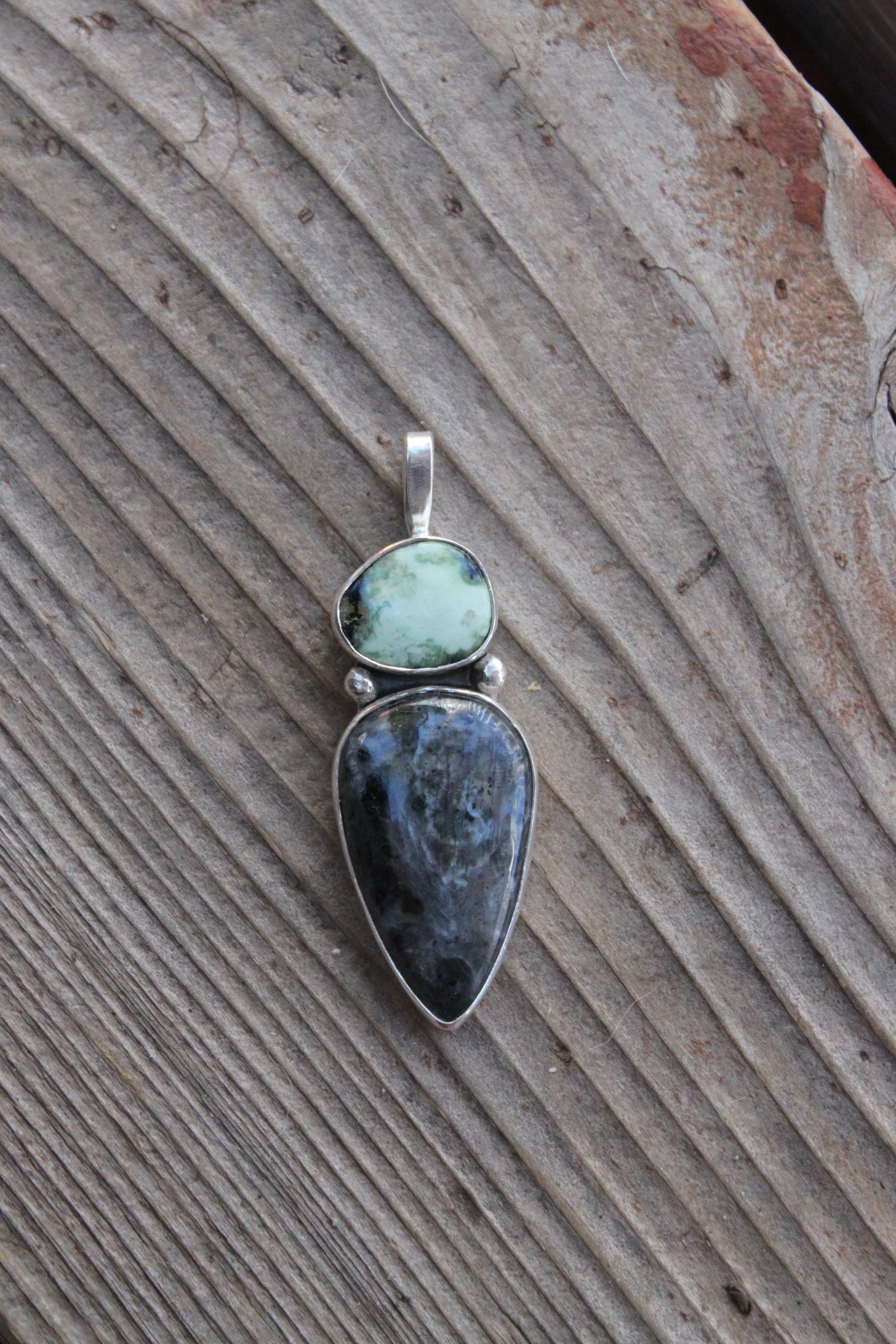 This pendant has been handcrafted with ethically sourced New Lander Turquoise and Larvikite stones, and 100% 925 sterling silver, making it truly one of a kind.